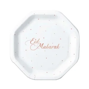 Bordjes – 8 stuks – 23 cm – Eid Mubarak – wit / roségoud