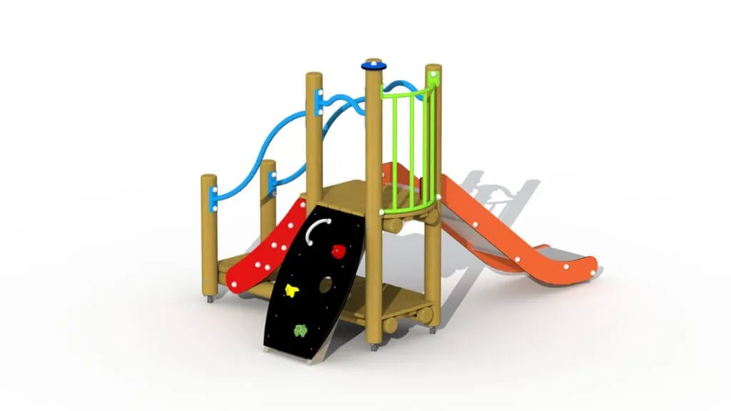De F500 Assepoester is één van de vele kleurrijke, rondhouten speeltoestellen uit de Sprookjesserie voor kinderen van 2 tot 6 jaar. De speeltoren bestaat uit twee platformen boven elkaar. Het bovenste platform heeft een hoogte van 84cm. De Assepoester heeft inox glijbaan met HDPE polyethyleen glijbaanboorden, maar is ook verkrijgbaar met een kunststof glijbaan. Het speelhuisje kan betreden worden via een gemakkelijke trap met metalen leuningen en een HDPE polyethyleen klimwand met kunststof klimgrepen. Het hoogste platform is voorzien van een balustrade met een kleurrijk metalen hekje. De rondhouten lariks palen hebben een diameter van 10 cm en worden met metalen voetsteunen in of op de grond bevestigd. Een mooi compact speeltoestel voor een beperkte ruimte en mag op gras geplaatst worden. Heeft u liever een uitgebreider speeltoestel van deze Sprookjesserie, neem dan contact met ons op, wij helpen u graag met uw keuze.