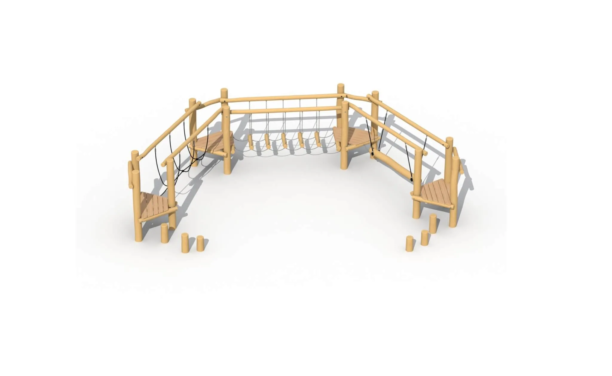 De combinatie bestaat uit de speeltoestellen RO620 Touwbrug, RO610 Wiebelbrug, RO650 Evenwichtsbalk.
