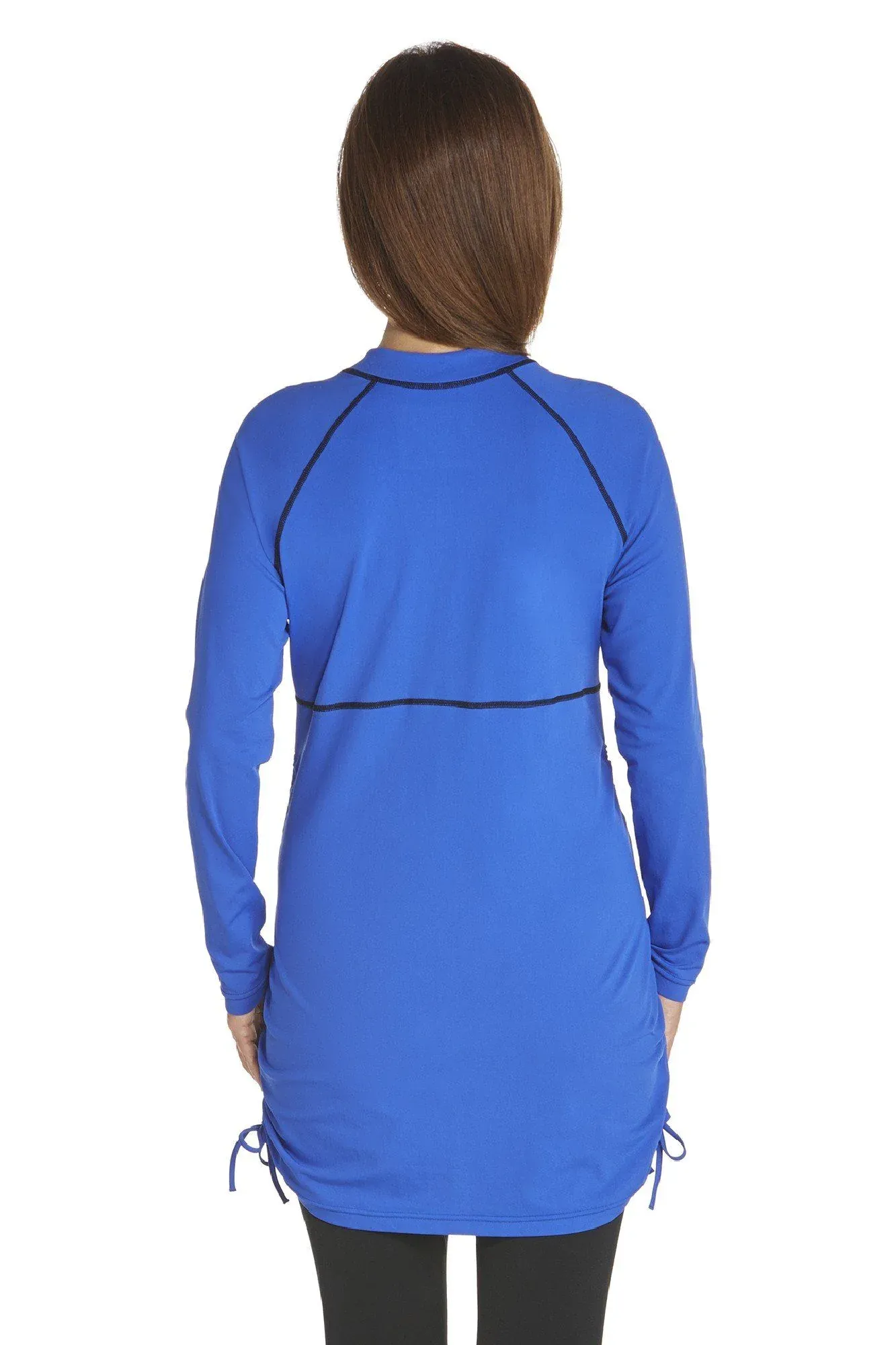 Twee looks in één: de zijnaden van deze UV-werende top in kobalt blauw kun je met een rijgkoordje omhoog halen, zodat de onderkant niet nat wordt tijdens het pootje baden of je kunt de koordjes los laten om te profiteren van de langere lengte en optimale bescherming. Je draagt ‘m dus als top of tuniek. De top is ideaal om in te zwemmen, beschermt de huid optimaal, is makkelijk in onderhoud en kan ook in zout water en chloorhoudend water gedragen worden. De kleur en het materiaal blijven prachtig, ook na vele malen wassen. In het water mooi, maar ook daarbuiten en goed te combineren met bijvoorbeeld een bijpassende legging van Coolibar. Het korte ritsje bij de hals geeft ook bescherming van UPF50+ aan hals, nek en decolleté.
