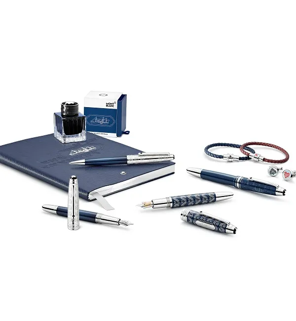 De Meisterstück Around the World in 80 Days-collectie is geïnspireerd op de beroemde avonturenroman van Jules Vernes. De Fountian Pen vervaardigd van blauw edelhars, tekent het eerste deel van de reis. De hoofdpersoon reist, voornamelijk per stoomboot, van Londen naar Bombay, steekt de Middellandse Zee over en dan door het Suezkanaal. De dop heeft een patroon van de belangrijkste elementen van de roman: oceaangolven en speelkaarten.