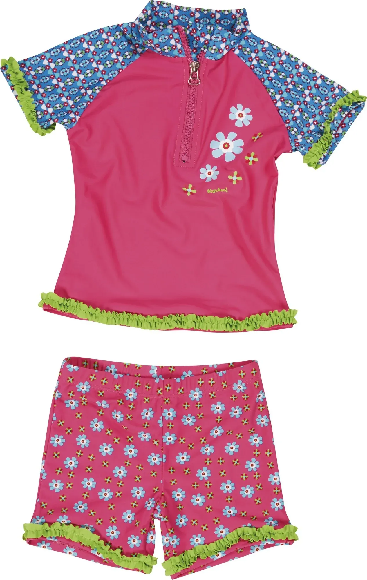 Dit kleurrijke zwemsetje in Bloemen stijl van Playshoes bestaat uit een T-shirt en een broekje van UV werend materiaal. Het shirtje beschermt buik, rug en armen en het broekje bovenbenen en billen tegen de zon en UV straling. Het UV shirtje heeft een handige rits bij de hals, waardoor het gemakkelijk aan en uit getrokken kan worden. Het materiaal voorkomt huiduitslag en beschermt optimaal tegen zon en UV. Dit zwemsetje kan gebruikt worden in elk type water en ziet er trendy uit. Ook verkrijgbaar in meerdere kleuren en stijlen.Over het merk Playshoes: Het Duitse Playshoes biedt een breed scala aan kinderkleding en accessoires. UV werende badkleding voor kinderen wordt steeds belangrijker in de kindergarderobe en hier speelt Playshoes goed op in. Trendy zwempakjes, broekjes, shirtjes, hoedjes, zwemluiers en zonnehoezen voor de buggy! Playshoes houdt zich aan de EU-richtlijnen: Alle producten van Playshoes zijn geproduceerd onder strenge EU-normen. De producten overschrijden niet de grenswaarde m.b.t. chemische stoffen. Bovendien zijn de producten gecontroleerd door het onafhankelijke Prüfinstitut Hohenstein Instituut en goedgekeurd op schadelijke stoffen en UV-bescherming.
