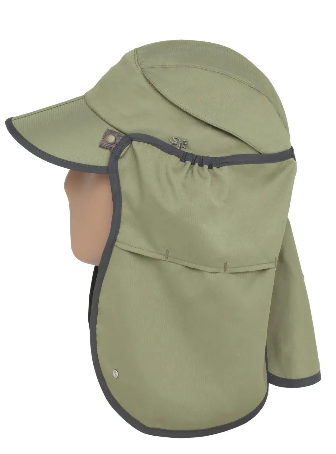 De nekflap is in drie vaste delen (vormbaarheid) en afneembaar, met een drukknoopje te bevestigen aan de schaduwklep. Voor dames of heren met een paardenstaart is er ook voldoende ruimte. Maar we zijn er nog niet! De zonnecap is klein opvouwbaar door de voorgevormde knik in de schaduwklep. De nekflap is met een drukknoop vast te zetten onder de kin of om deels het gezicht te bedekken. Aan de achterkant kun je de cap op maat maken. De stof is waterafstotend, dus bij een zomers regenbuitje heb je ook bescherming.